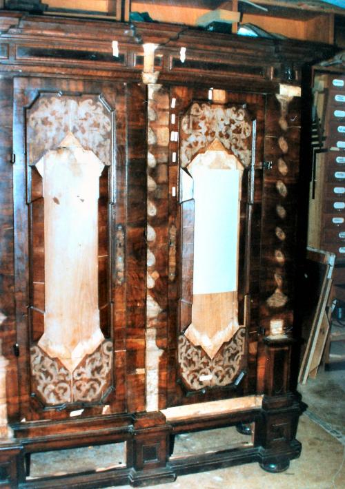 Das Furnier hatte sich aber an vielen Stellen gelöst. Ebenso die Schnitzereien und die Bastionsprofile in den Füllungsfeldern der Türen.