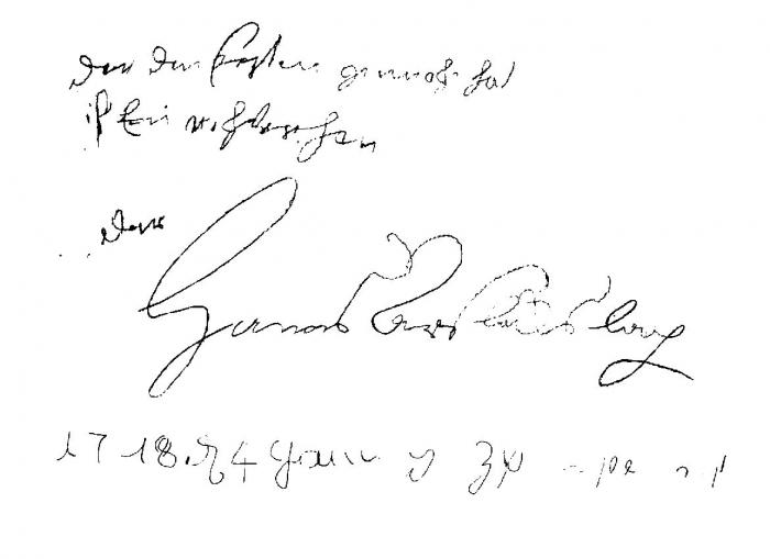 Die abgepauste Signatur: " Der den Kasten gemacht hat ist ein Tischlerson - der Hannes Urs - Bocksbach "